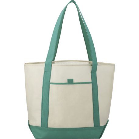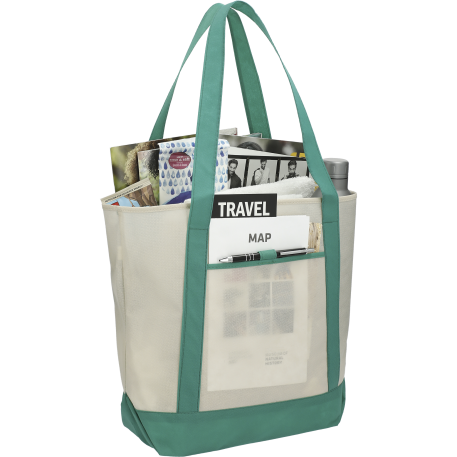 The Lighthouse Non-Woven Boat Tote features an open main compartment and a front pocket with a pen loop. Including double 24 inch handles it's also reusable and a great alternative to plastic bags.
