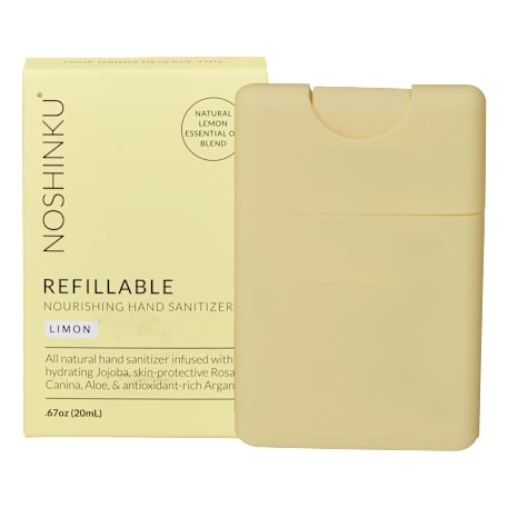 The 0.67oz Noshinku Refillable Pocket Hand Sanitizer features a hydrating and nourishing sanitizer blended with 70% pharma-grade ethyl alcohol distilled from organic cane sugar alongside a conditioning blend of Aloe, Rosa Canina, Jojoba and Argan to soothe, moisturize and protect skin. Noshinku sanitizer is an FDA-Registered and Compliant Formula. Each sprayer contains approximately 270 sprays and can be refilled. Made in the USA. Scents: BK (Bergamot), BL (Vetiver), GR (Eucalyptus), LV (Lavender) and YW (Lemon).