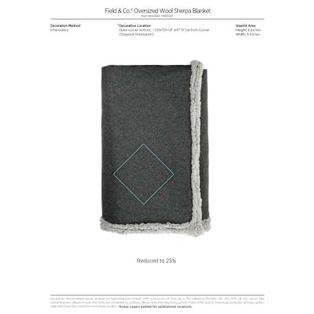 The Field & Co.® Wool Sherpa Blanket features a classic look with timeless style. Combines a wool blend on one side and 210g Sherpa on the other side to stay warm and cozy. Unfolded the blanket is 60" x 70". Free run charges for embroidery up to 10,000 stitches. Folded dimensions are 20" x 14". This blanket is spot clean only.