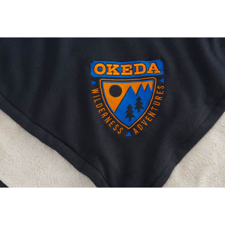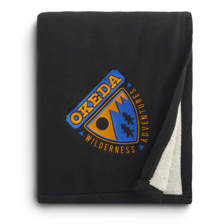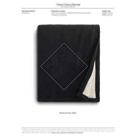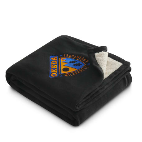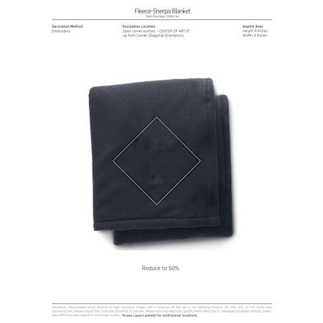 Polar fleece on one side and soft sherpa on the other. Snuggling up in this blanket will keep you extra warm on the chilliest winter nights. Free run charges for embroidery up to 10,000 stitches. The open dimensions are 60" x 50" and folded dimensions are 14.5" x 12". This blanket is spot clean only.