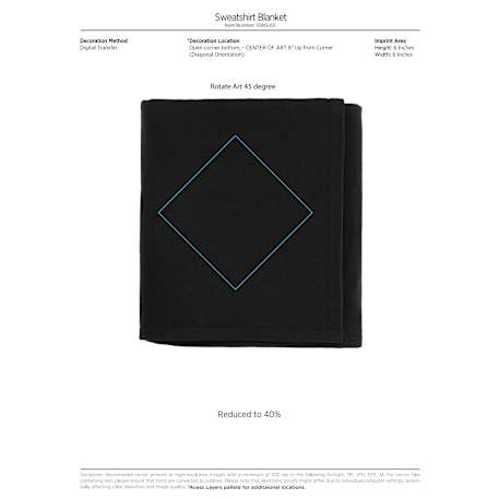 80% cotton/20% polyester hemmed blanket. Open dimensions are 50" x 60" and folded dimensions are 12.5" x 12". Free embroidery run charges on up to 10,000 stitches. This blanket is spot clean only.