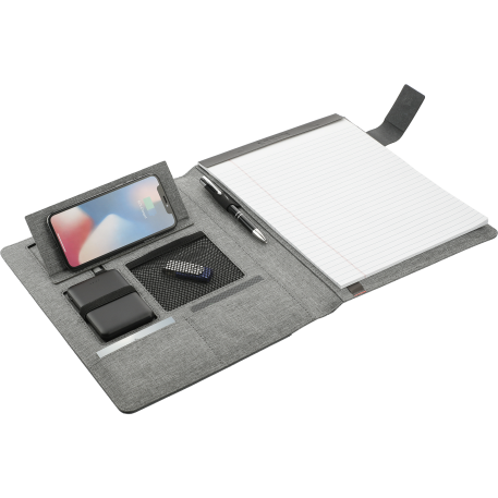 The Reclaim RPET 5000 mAh Wireless Charging Writing Pad with FSC® Mix Paper is a rechargeable powerbank that supports wireless charging for a wide range of mobile devices, including the iPhone 8 and later generations. It comes with one USB to Micro USB cable, enabling you to charge any device with a Micro USB input or recharge the Reclaim itself. To charge an iPhone 7 or earlier series that does not feature built-in wireless technology, simply connect the Micro USB cable. The Reclaim RPET doubles as a journal, containing one 8.5'' x 11'' FSC® Mix writing pad with 30 sheets of recycled lined paper. For added functionality, the writing pad features a front pocket, interior mesh pocket, snug elastic pen loop, magnetic closure clasp, and card organizer pockets.