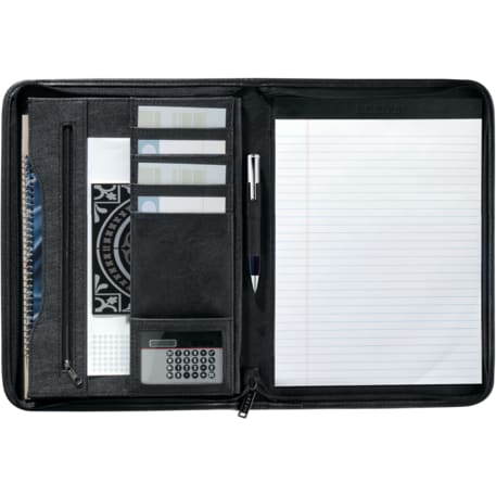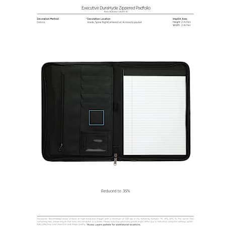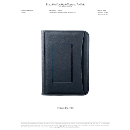 The premium Executive DuraHyde Zippered Padfolio with FSC® Mix Paper features an interior organizer with gusseted file pocket. This zippered closure padfolio includes Clear ID or calculator pocket and front slot pocket. The Executive DuraHyde Zippered Padfolio includes a 8.5" x 11" FSC® Mix writing pad. Refills available leedsworldrefill. Refill item number: 9091-01. Pen not included.