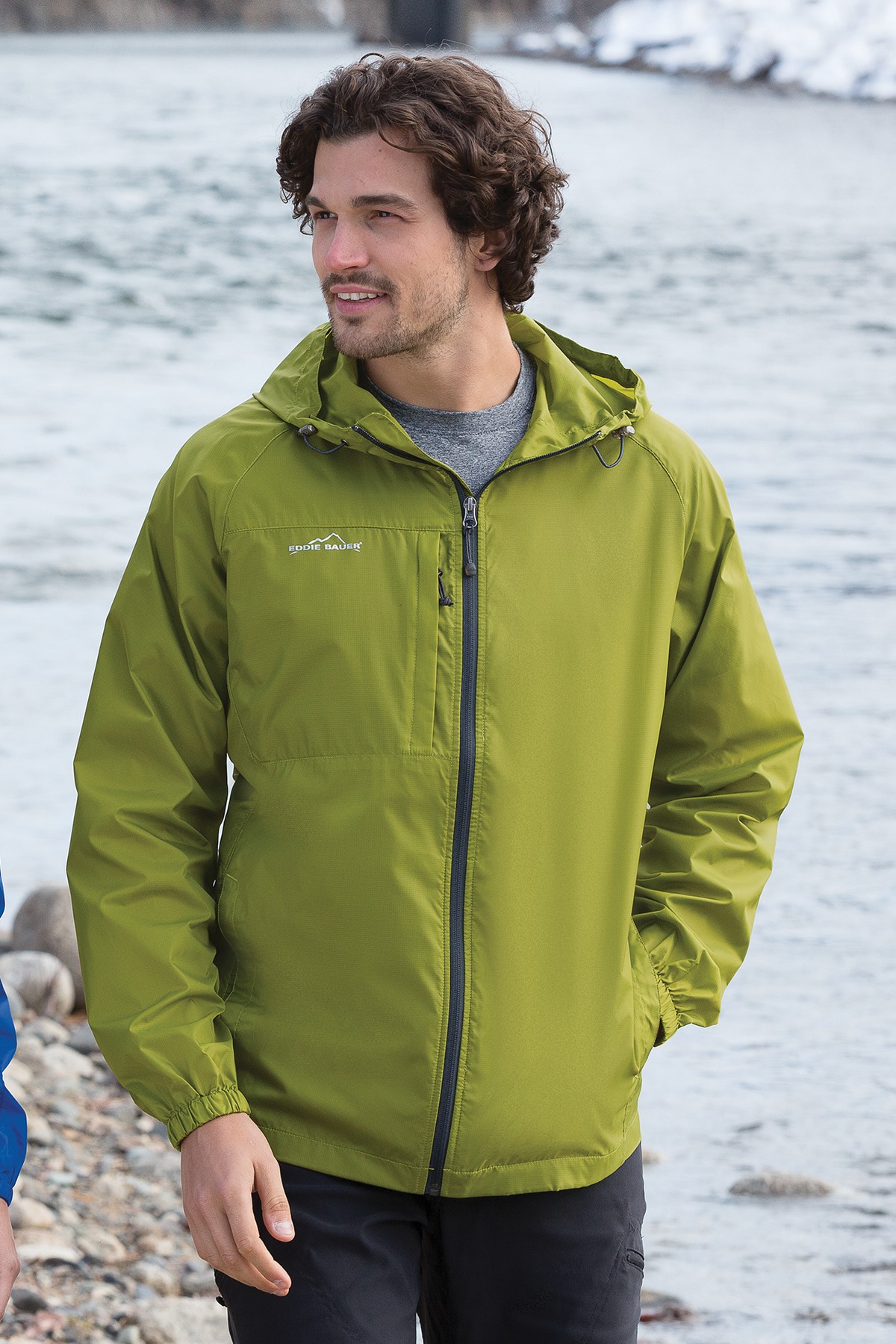 Wind was the inspiration for this compact layer,Plus, it packs down into its own logoed pocket, making it easy to carry wherever you go,Hood with locking drawcords for adjustability, contrast reverse coil zipper, underarm vents, packable zippered chest pocket, front unzippered pockets, elastic cuffs and an open hem,Contrast Eddie Bauer logo on right chest,Made of 100% nylon.