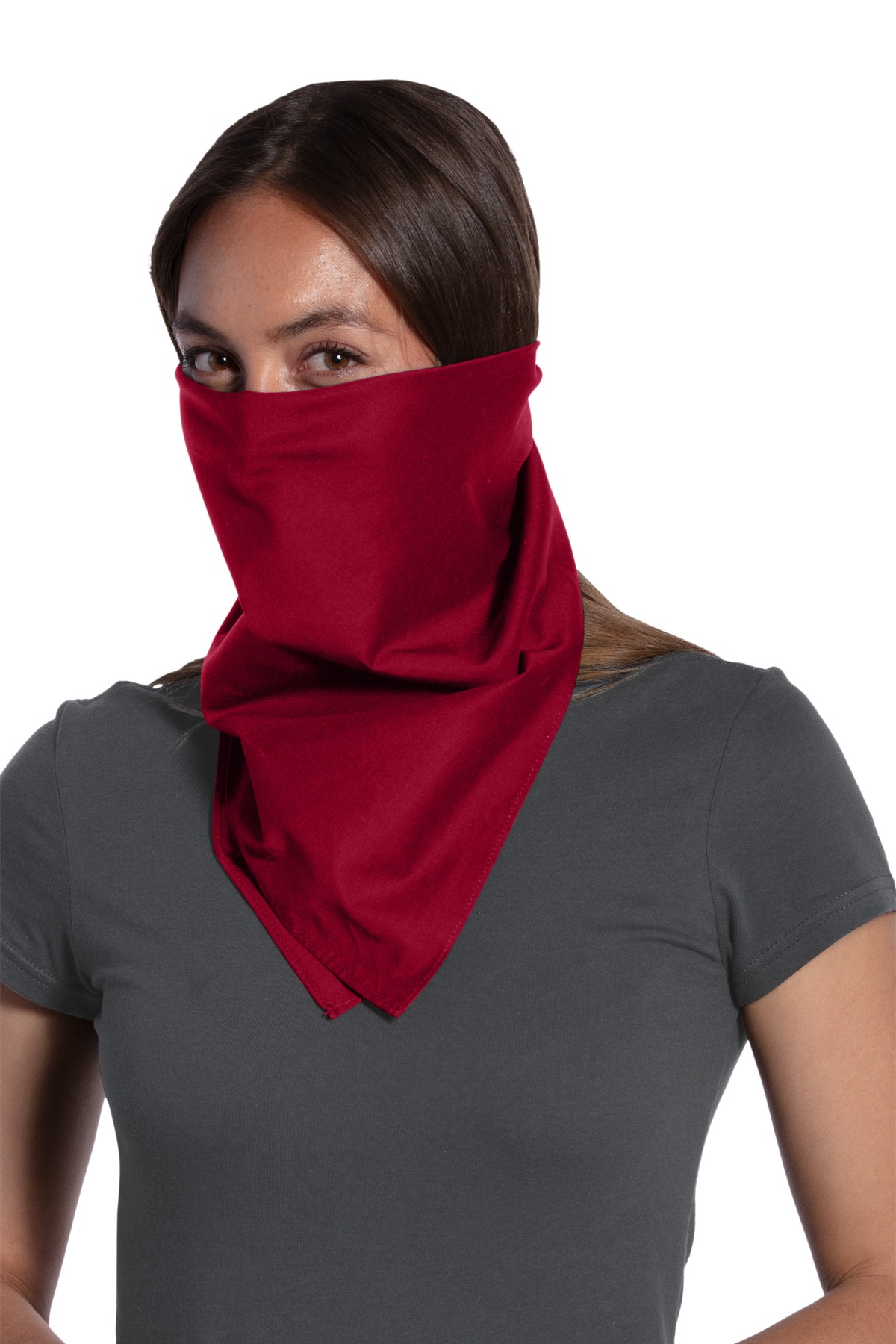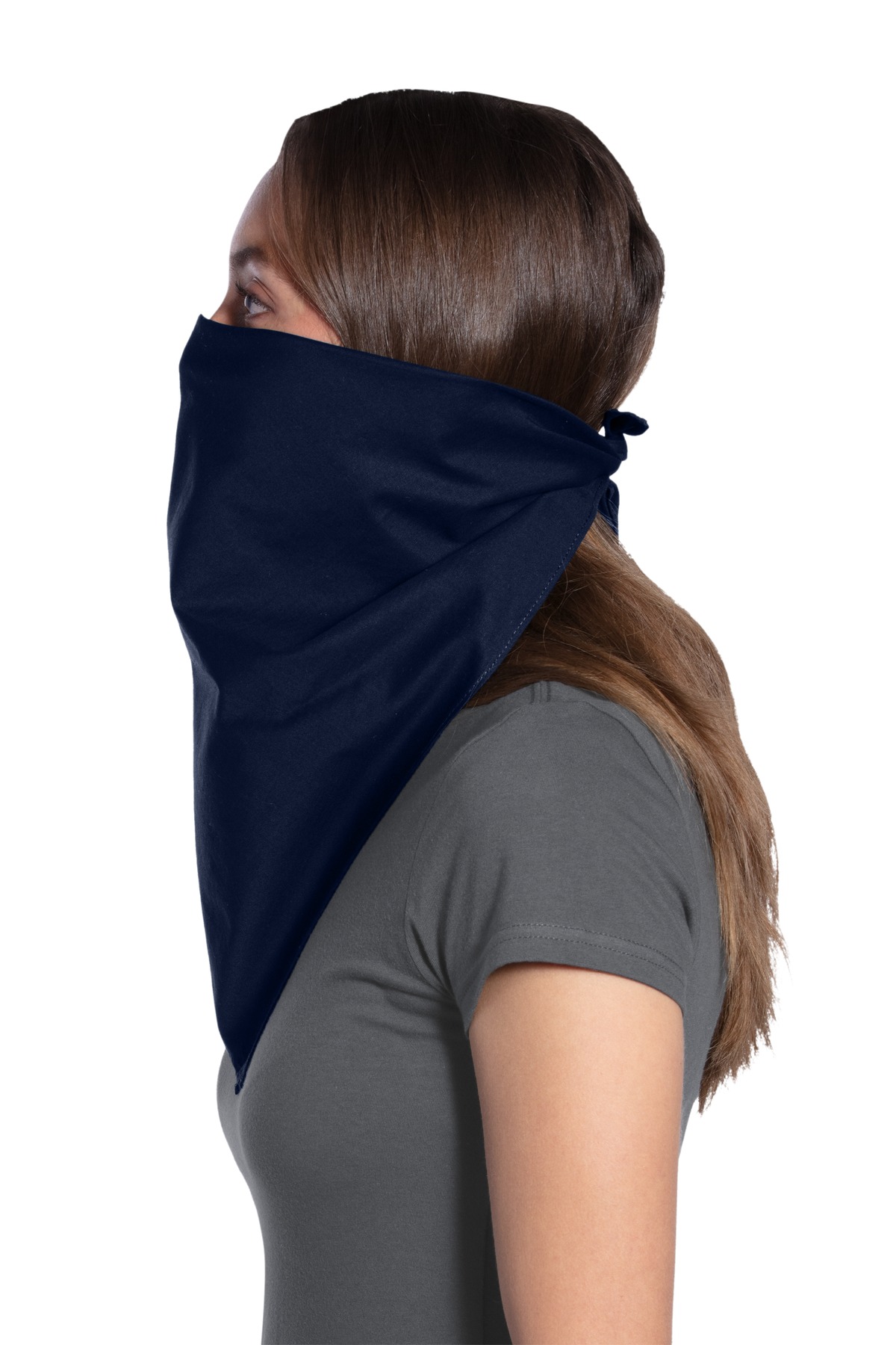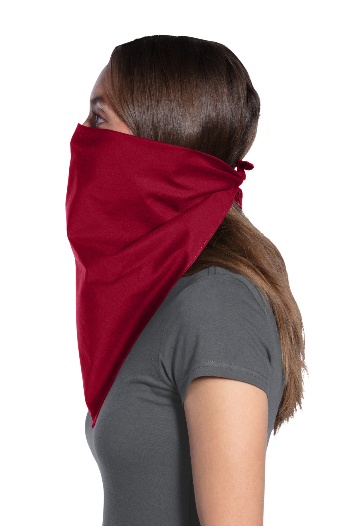 Sized larger than an average bandana, this durable bandana offers more face covering and decoration space. Versatile and multifunctional, it can also serve as a headband or neckerchief. Fold bandana diagonally and tie around head to cover face as desired.,80/20 poly/cotton sheeting,Finished seams prevent fraying,Measures: 23" x 23",Machine washable