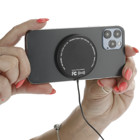 The MagClick™ Fast Wireless Charging Pad can magnetically attach to iPhone 12/13/14 models for wireless charging. It supports three different wireless charging modes: 7.5W for iPhone 8/X/11/12/13/14 Series; 10W for Samsung Galaxy S9/S9 Plus/S8/S8 Plus/Note 8/9 and more, and 5W standard charging for all enabled devices. Includes a 39-inch integrated charging cable with USB-A tip. It is recommended to use quick charge power adapter (10W at least, not included) to achieve fast charging.