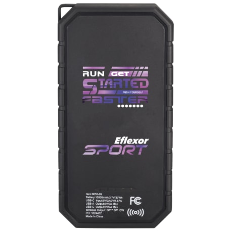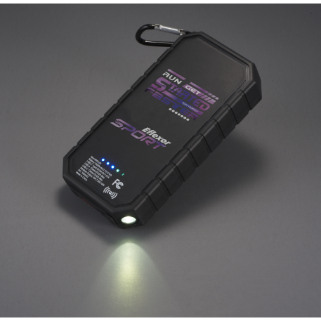 The High Sierra® IPX5 Solar Fast Wireless Power Bank has a 10,000 mAh rechargeable lithium polymer battery (37Wh) that works as a wireless charging pad or normal power bank. It has a solar panel, a built-in flashlight and a carabiner clip for easy carrying. IPX5 Waterproof. USB Output: 5V/2.4A; Type-C Output: 5V/2.4A. Supports three wireless charging modes: 7.5W for All iPhone 8/X/11/12/13 Series; 10W for Samsung Galaxy S9/S9 plus/S8/S8 Plus/Note 9/8 and more, and 5W standard charging for all enabled devices. To charge phones without wireless technology, an external Qi-standard wireless charging receiver or receiver case is required. Wired charging will work with any smartphone or tablet. Works with most plastic phone cases on. Includes a USB-to-Type-C charging cable. Power banks are permitted in carry-on luggage only, and at the discretion of TSA agents. Please charge power bank before initial use. Comes packaged in an FSC®-certified giftbox.