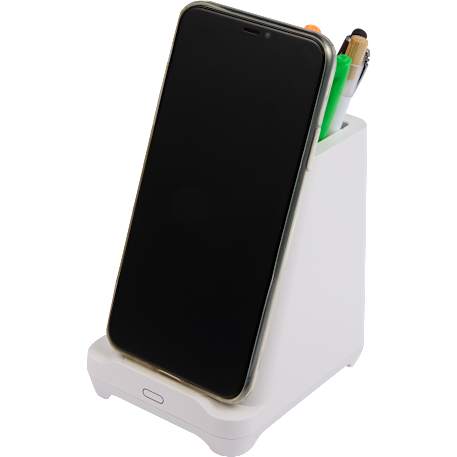 The desk mate includes all of your desktop essentials: Bluetooth Speaker, Stand, Charging Hub, and pen holder. The bluetooth speaker will provide over three hours of playback time at max volume. The built in microphone allows the the desk mate to be used for conference calls without holding your phone. The USB C and USB A charging hub allow you to charge your devices at your desk.