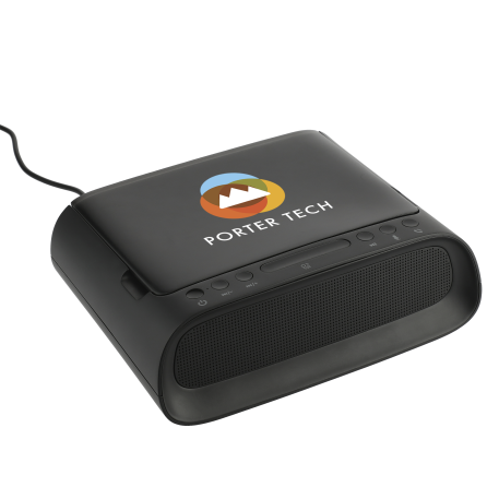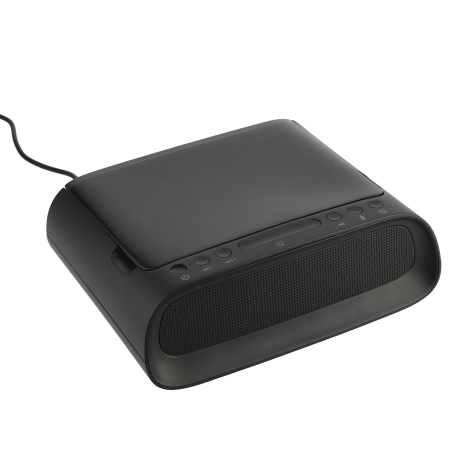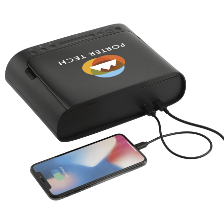 The Desktop UV Sanitizer & Bluetooth Speaker combines premium sound, 3 UVC lights, music controls, & a microphone. Simply open the top lid & place your mobile phone, jewelry, or mask to begin the cleaning process. The speaker features a 3-minute quick clean & a 5 minute thorough clean. The 3-watt Bluetooth speaker produces premium sound that can be heard around the office! The full music controls allow you to activate your voice assistance, change the audio, control the volume, & accept/reject calls. The built-in microphone allows you to use the speaker for your conference calls. Included with the speaker is 31” Type C cable to provide power to the speaker. With a built in USB output the speaker can be used to your charge any electronic device. The speaker must be plugged in to a power source to power on, it doesn’t have a built-in battery. Fits phones up to 6.5" x 4.25". Available for shipment within the United States (including Alaska Hawaii & Puerto Rico). Not available for export.